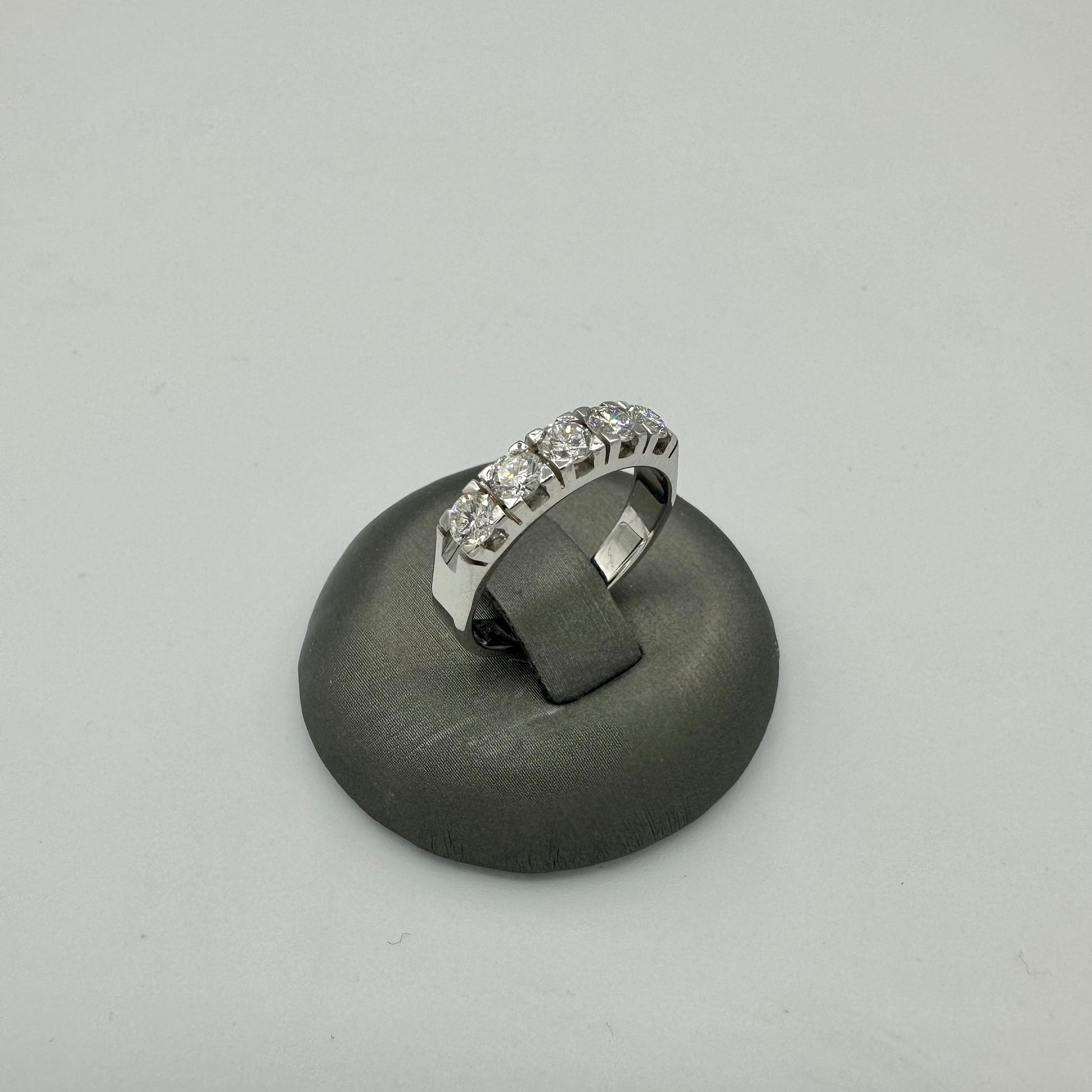 Anello in oro bianco 750 (18kt) di nostra produzione artigianale del laboratorio orafo Gioielleria Ruggeri Bologna. L’anello è arricchito con 5 diamanti taglio brillante (rotondo) per un totale di 1,00 ct. colore G e purezza VS